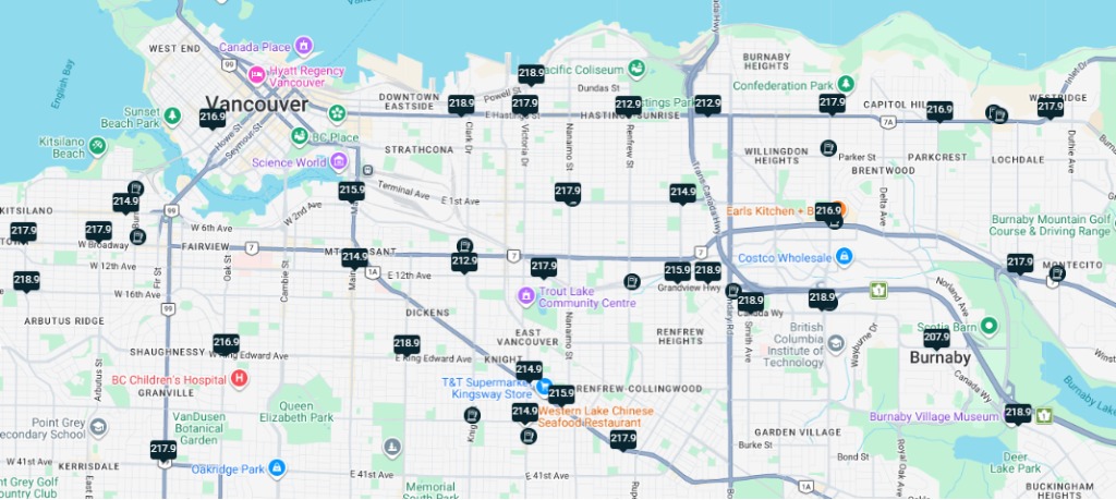 周三,大溫地區的司機們在加油站遭遇了更沉重的負擔,一些加油站的汽油價格達到了每升218.9分。