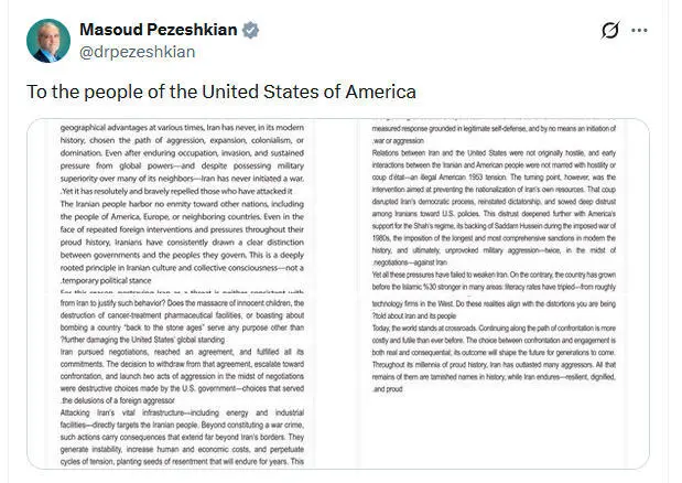 美以伊战争持续了1个多月,当地时间4月1日,伊朗(专题)总统佩泽希齐扬在社交平台X上发表致美国民众的公开信,称这场战争不符合美国人民的利益,美国已沦为以色列(专题)的代理人。