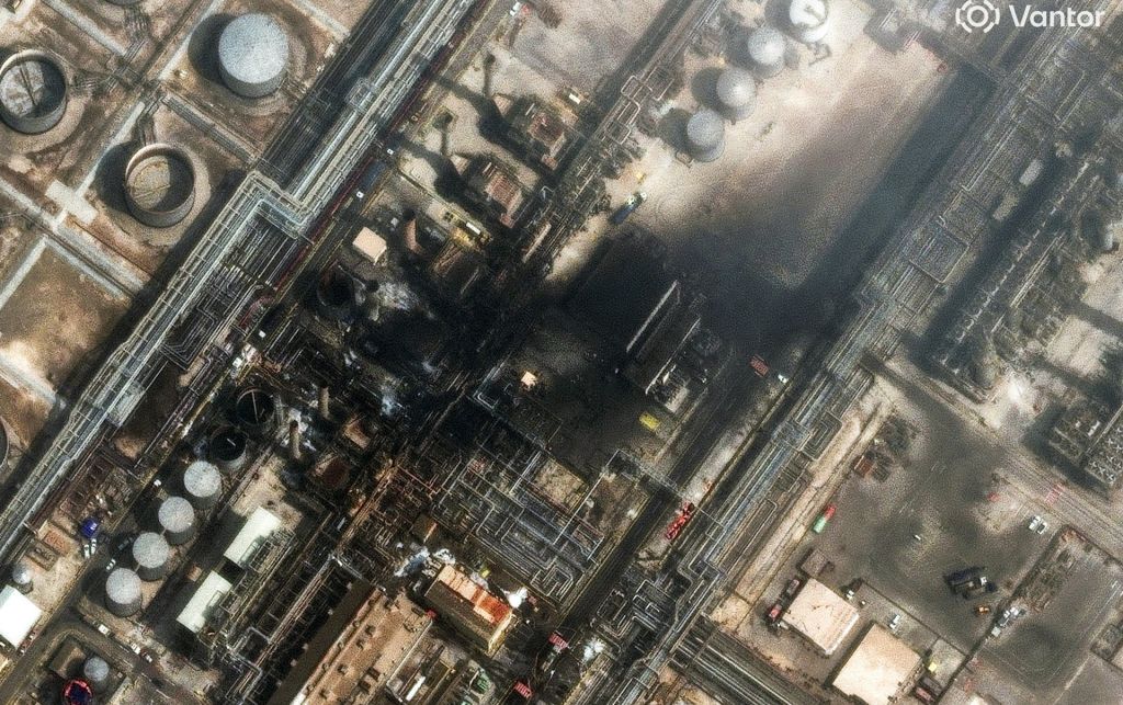 2026年3月2日,沙特阿拉伯拉斯塔努拉(Ras Tanura),卫星图像显示,美国以色列(专题)与伊朗(专题)持续开火之际,炼油厂遭无人机袭击后冒出浓烟。(Reuters)