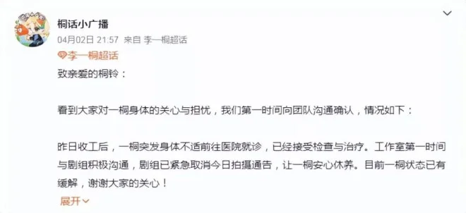 因病引发关注后,其工作室发布声明,已取消次日的拍摄计划,并强调“将艺人的身体健康放在首位”。