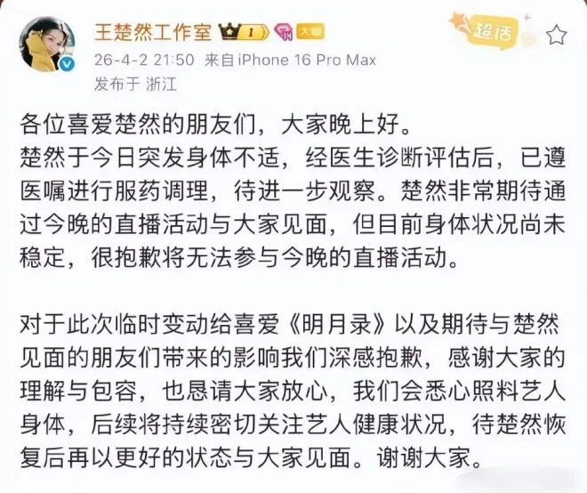 同样是4月2日,当红“95花”王楚然也忽然身体不适,临时取消《明月录》剧组直播活动。