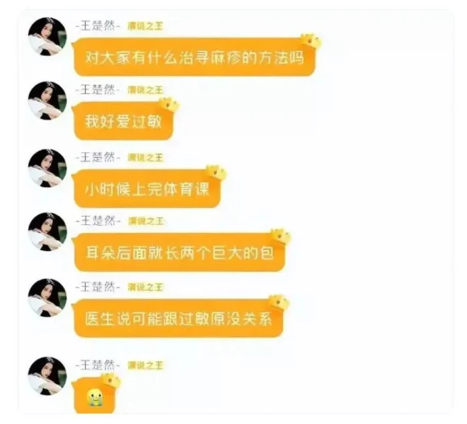 其实早在去年,王楚然便公开求助粉丝,寻找治疗荨麻疹的方式,并坦言自己是易过敏体质,每当剧烈运动或情绪波动时容易反复发作,并为此多次求医测敏源。