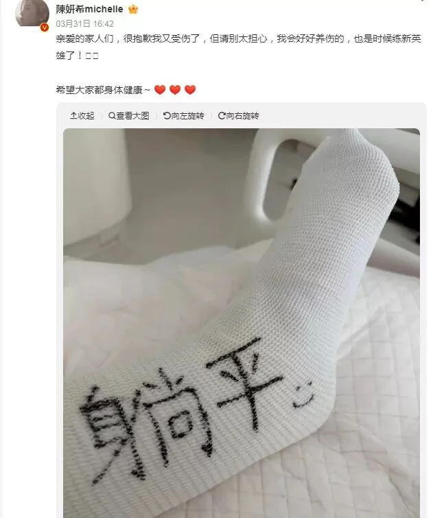 3月30日,43岁的女演员陈妍希在进行运动训练时左脚跟腱断裂,受伤次日凌晨完成了微创手术。