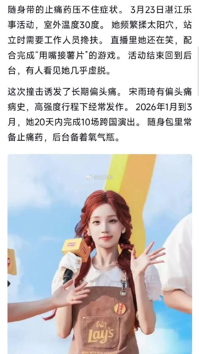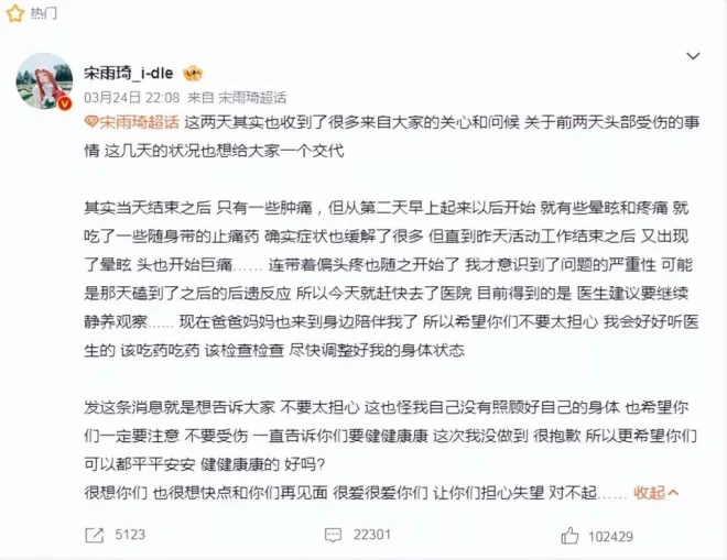 同样是上个月,在曼谷参加巡回演唱会的宋雨琦,忽然因升降台机械故障,后脑勺意外遭受猛烈撞击,而引发剧烈头痛和眩晕。