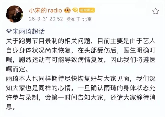 既定工作完成后,宋雨琦才彻底开始休养,期间多次发文表示情况已明显好转,但因休养也不得不缺席了《奔跑吧14》的录制工作。