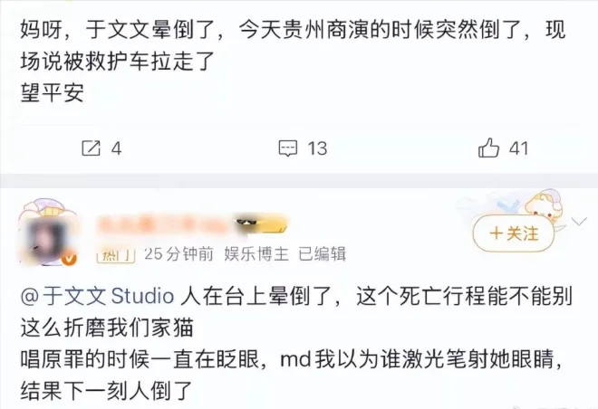 早在2月,于文文便接连参加了广告拍摄、颁奖典礼,连续三天的综艺录制,甚至晕倒前一天,还在深圳完成了一场商业演出。