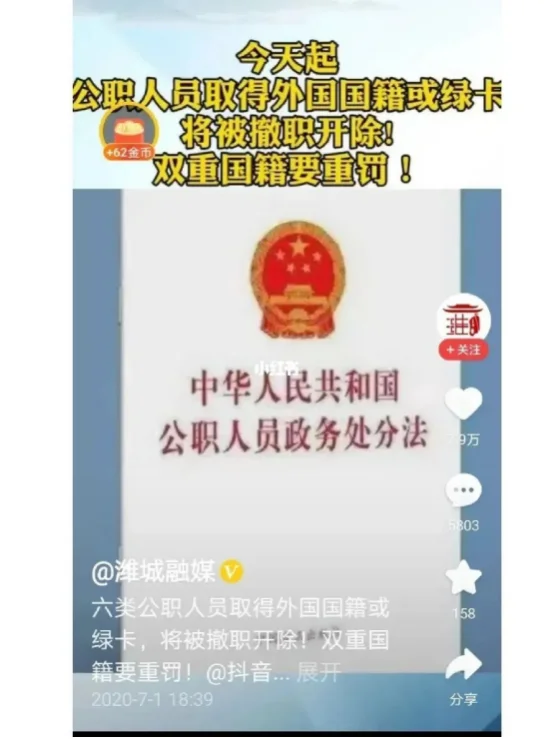 2020年7月1日的潍城融媒抖音号,内容显示根据《公职人员政务处分法》,六类公职人员取得外国国籍或永久居留权将被撤职开除。