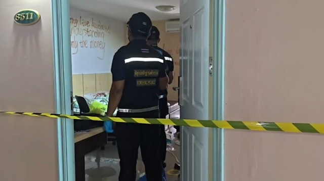 調查人員進入涉事套房後,發現21歲的女死者娜特尼查(Nattnicha)全身赤裸倒臥在地,頸部、胸部、腹部及四肢均有大面積利器割傷痕跡。(Amarin News FB)