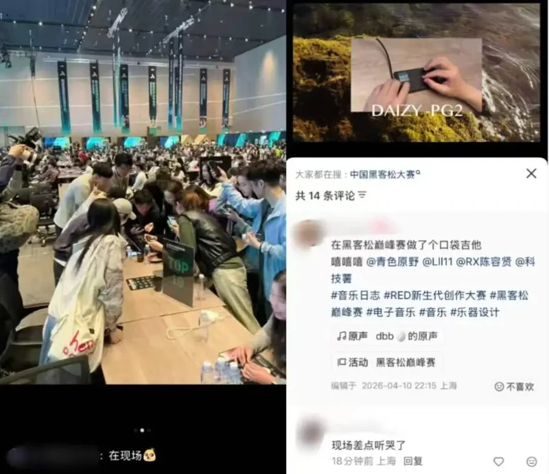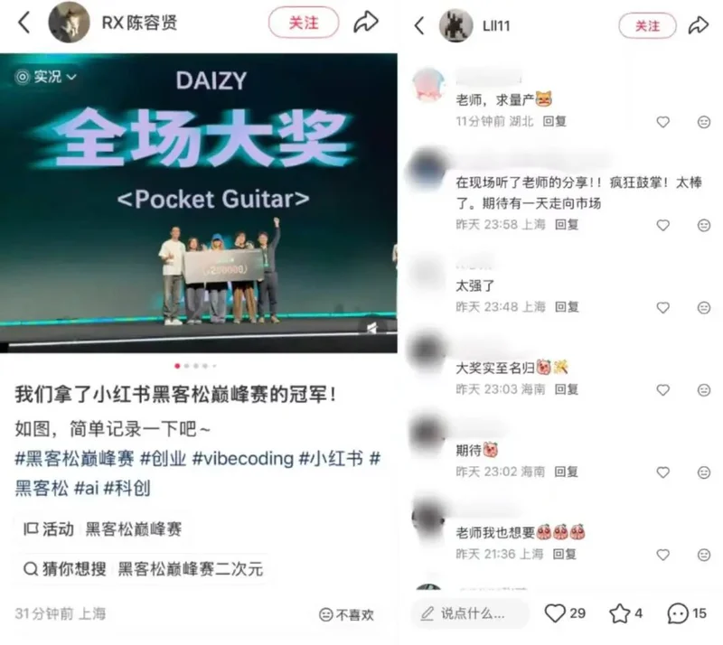 榮獲本次全場大獎的,是一款可以裝進口袋的AI吉他“Pocket Guitar”,幾位年輕設計者的小紅書,已經被排隊期待的評論攻陷。甚至有評委當場詢問定價,表示自己也要買一個。