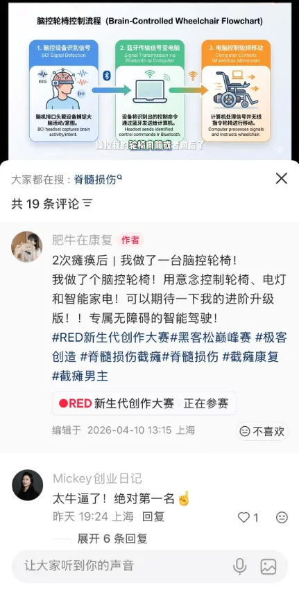 這玩意兒簡直是碳基大腦和硅基機械的弗蘭肯斯坦,直接讀取腦電信號,用意念就能驅動輪椅移動,還能控制鼠標。開發者“肥牛”(小紅書@肥牛在康復)表示,後期加上攝像頭等設備,還能實現無障礙路線規劃、以及聯動點燈、智能家居等,對生活全方位的賽博接管,把失能人群的生活Bug一個接一個地修復掉。