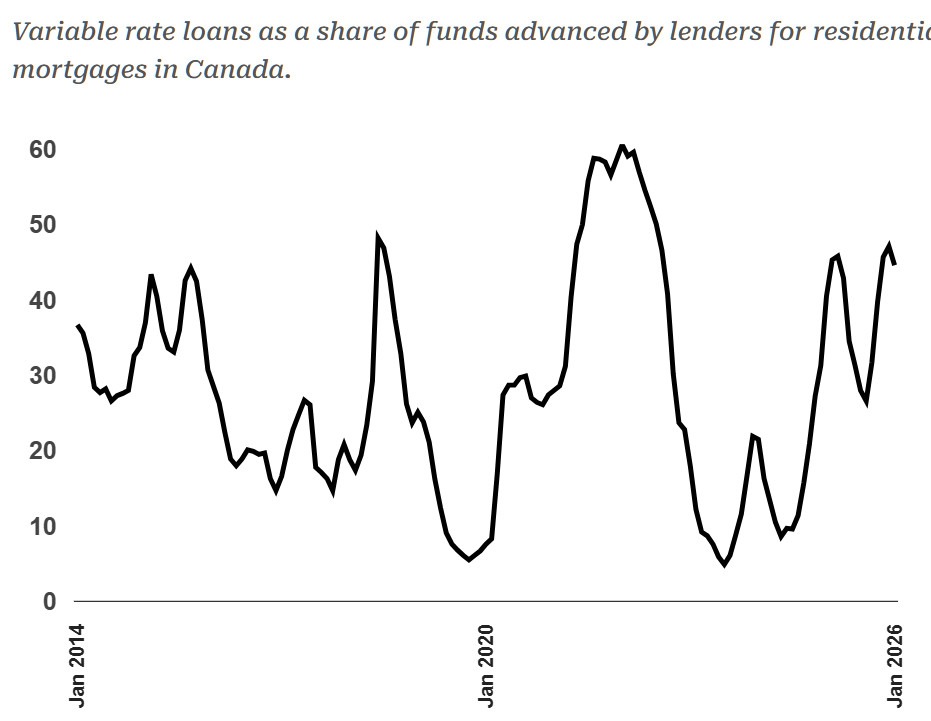 加拿大人再次涌向浮动利率抵押贷款,近45%的贷款发放资金用于此类贷款,较2023年7月创下的4.9%的历史低点大幅攀升。