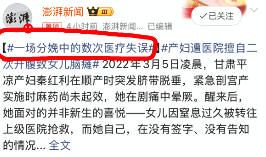 看了一下这篇长报道,其中最离谱的一幕是“医生发现纱布少了一块,用x光看了看,原来在产妇肚子里,于是没有告知、没有签字、没有明确医嘱,直接给产妇第二次开腹,把纱布取了出来。”