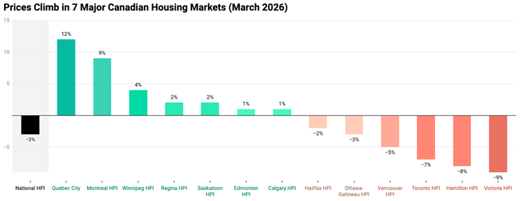 根據2026 年 3 月最新房價指數報告,3 月份加拿大全國房價同比下降 3%,這一年跌幅略大於今年前兩個月的跌幅,當時該指數的年跌幅為2%。全國房價跌幅加大,至少部分原因是區域性房價普遍下跌所致。