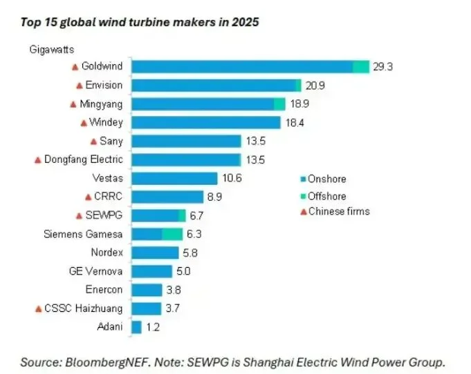以风电为例,彭博新能源财经公布的2025年全球风力发电机组排行榜,金风科技、远景能源、明阳智能、运达股份、三一重能、东方电气风电等中国整机商包揽前六。