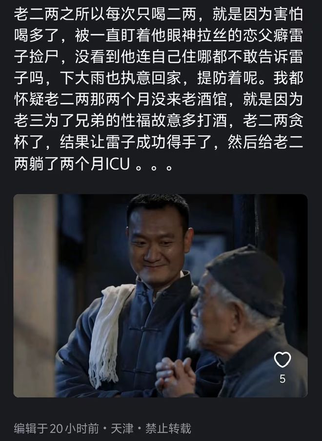 ¸ù¾Ý¾çÇé½âÊÍ£¬Õâ¸ö·´³£µÄ±íÏÖÊÇÒòΪÀ××Ó¾õµÃÀ϶þÁ½ÌرðÏñ×Ô¼ºµÄµù¡£µ«¾ÍÏñÀ϶þÁ½°×Õ¼ÀϾƹÝÒ»¸öλÖ㬲»±»ÏÖ´úÈËÀí½âÒ»Ñù£¬À××ÓµÄÐÐΪ£¬Ò²Í¬ÑùºÜÄѱ»ÏÖÔڵġ°Ð¡µÇ¡±ÍøÓѹ²Ç顪¡ªÄãÒ»¸öÅÜÌÃ»ï¼Æ£¬ÔÚµêÀï²»¸É»î£¬ã¶¶¢×ÅÕâôһ¸öÀÏÍ·¿´¸Éʲô£¿