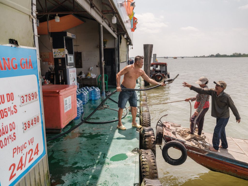 上个月,在湄公河三角洲,一艘销售柴油的浮动加油站。由于伊朗战争,越南深受燃料成本上涨的冲击。 LINH PHAM FOR THE NEW YORK TIMES