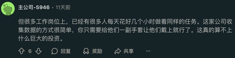 所以越来越多的数采方案开始强调"轻量化",设备越做越小,目标就是让采集完全融入日常工作,对工人的动作干扰降到零。业内已经有团队在研究把摄像头集成进普通眼镜,手套也在往更轻薄的方向迭代,最终形态可能是一副眼镜加一块手表,穿上就采,看不出来和普通上班有什么区别。