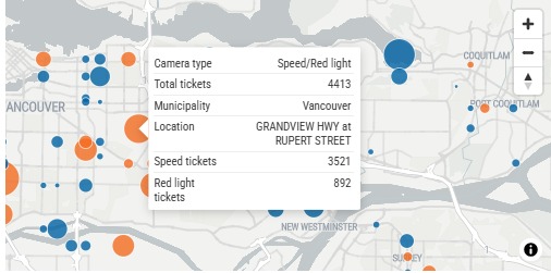 此外,Grandview Highway和Rupert Street以及Lougheed Highway和207th Street等多个路口也各自记录到超过3000宗超速违规。