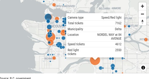 根据媒体对BC省数据的分析,在设有摄像头的路口中,违规次数最高的是三角洲Nordel Way和84th Avenue。2025年,该路口记录到4612宗超速行为及2550宗闯红灯行为。