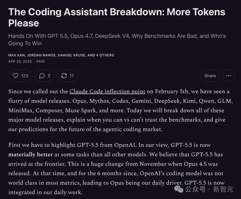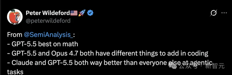 測試之後,AI行業分析機構SemiAnalysis坦承:在某些任務上的表現,GPT-5.5已經顯著超越了所有其他模型。
