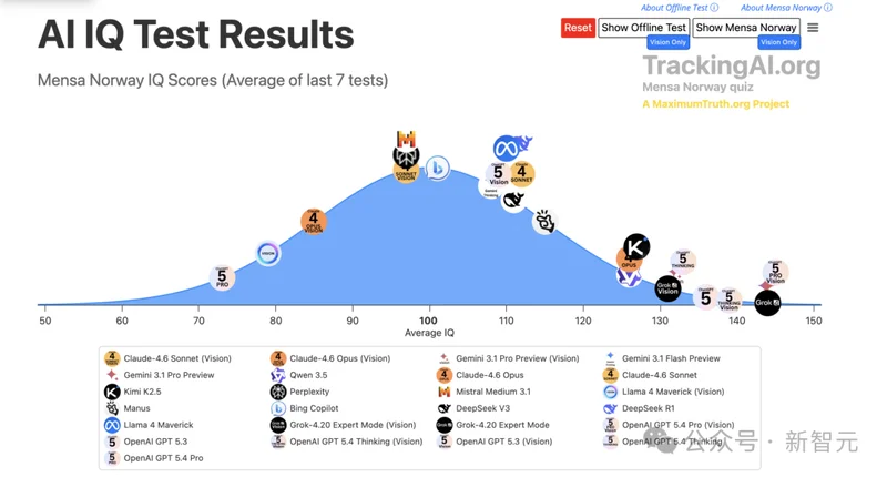 這並非孤例。就在本月初,GPT-5.4 Pro 已經在TrackingAI公開榜單上跑出150 IQ,登頂所有公開IQ跑分。