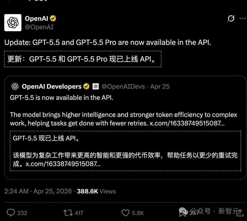 昨天,OpenAI API新品登場:GPT-5.5及Pro版現已可用,顯著提升智能水平和token效率,完美適配復雜任務場景,如編碼、分析等高負載應用。