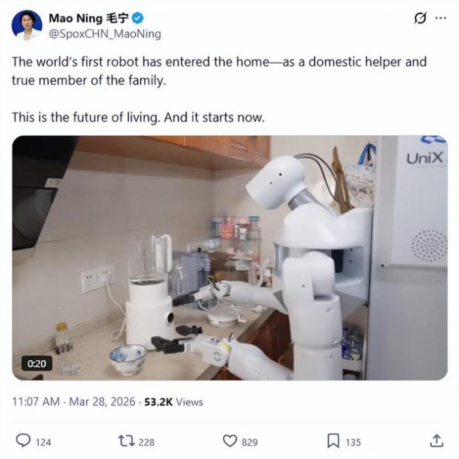 外交部發言人毛寧在海外社交平台X(原推特)轉發了這個視頻,並配文“世界上第一個進入家庭的機器人”。