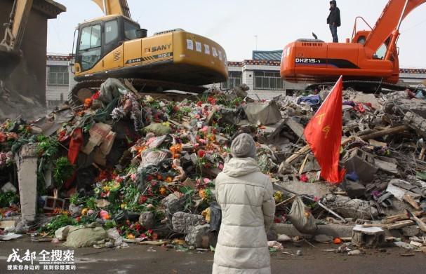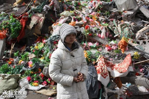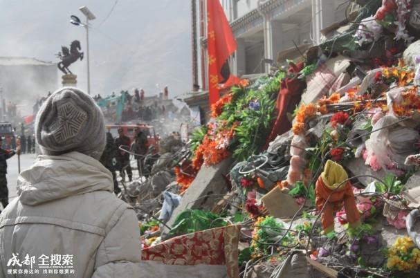 凡是参与了此次玉树抗震救灾的人,很容易留意到格萨尔广场旁边的一堆废墟,因为这对废墟里有很多鲜花。16日下午,我带着搜救队伍途径这座废墟时。一名十七八岁的小女孩一直跟在我后面,当时我正忙着搜救,就转身对她说:“小妹妹,这儿很危险,你快走。”女孩没有做声,默默地站在了原地,感觉眼里包着眼泪。第二天上午9点,我再次来到这堆布满鲜花的废墟时。头天的那个女孩又出现在了那里。带着白色的毛线帽子,穿着白色的长羽绒服,双手揣在包里默默地看着那堆废墟。
