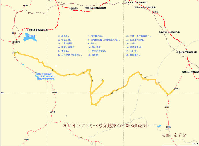 本次驾车穿越,从新疆库尔勒市尉犁县进入罗布泊,自西向东横向穿越,最后从甘肃敦煌出。历时7天,全程1250公里。