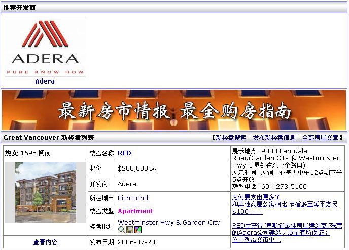 此外房屋中心还大力改进了新楼盘中心页面(http://www.westca.com/House/newhomelist.html),除增加了推荐发展商功能外(参见下面图5),还对新楼盘页面增加了很多功能,如图库,视频展示、评论等(参见下面图6)。