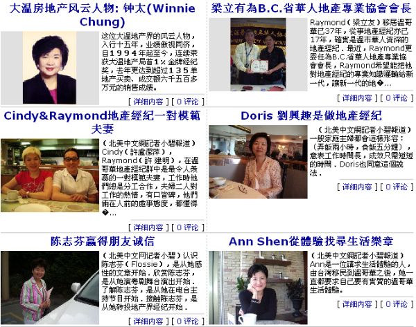 为加强经纪与网友之间的联系,北美中文网专访了多名地产界知名人士,设立了地产名人页面(http:.//www.westca.com/House/agentpro.html,见下面图1)。