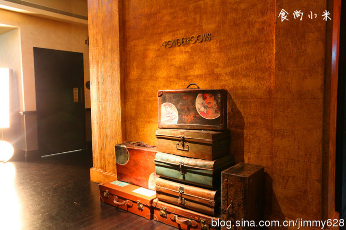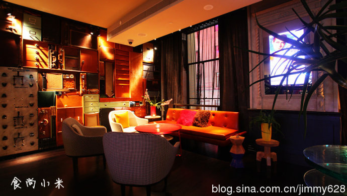 各种皮箱柜子门设计出来的一面墙,“无甚秩序”的设计主题在客房的布置中也可体现出来----客房中巨大的不对称红色床头,多彩的地毯,很特别的小动物雕像,金属质感的艺术品,圆形的黄色桌子......