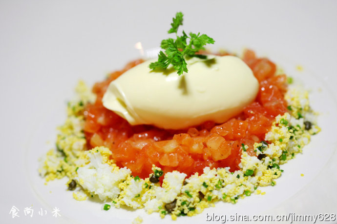 像小米一样的食材用低温烹熟变得弹牙配上西红柿的酸甜