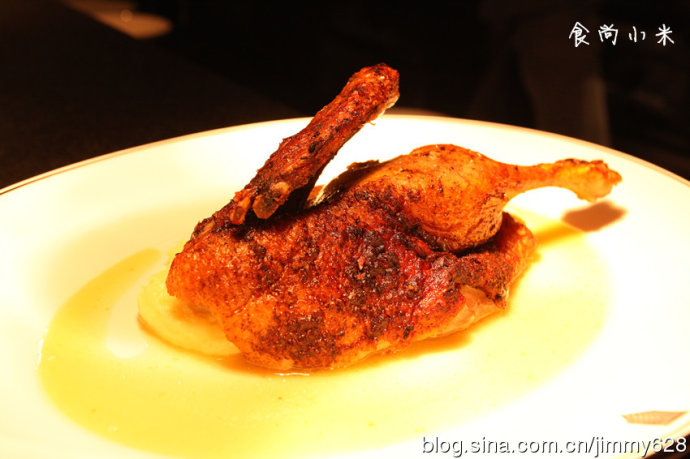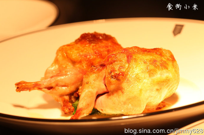 将小个的春鸡腌渍捆扎好再去烘烤可以得到外焦里嫩的奇异效果