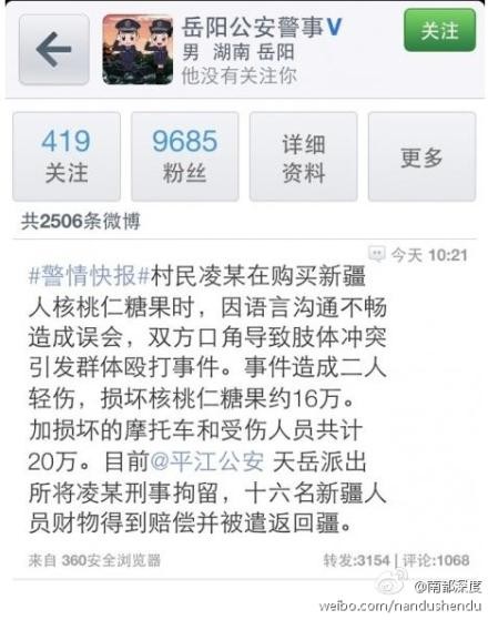 璐弓长:妈的,买的时候说五块,他称完要我付五十,不然一群新疆人围过来要砍我!