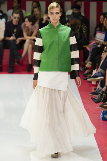 我喜欢这种黑白对比色,中间是绿色的皮质夹克,裸色飘逸的裙子形成一个美丽的轮廓。
