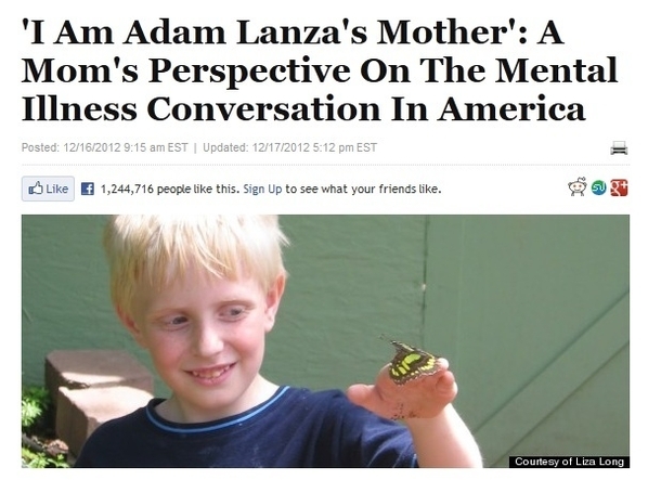 这位母亲名叫莉莎.朗(Liza Long),住在爱达荷州,有四个孩子。《赫芬顿邮报》以“我是亚当.兰扎的母亲”('I Am Adam Lanza's Mother')为题介绍了她的博文。从她的博文中可以看到,照顾具有无法预知特征的精神残疾儿童是多么困难。她写道,“我爱我的儿子,但他让我惊恐”。她的儿子迈克尔有时非常乖顺,是个很可爱的孩子。但是他会经常陷入大怒,会疯狂地骂人甚至使用暴力。几周前,朗告诉她的儿子到图书馆还书时,他顿时发作,威胁要先杀掉母亲,然后杀了自己。迈克尔有7岁和9岁的弟弟妹妹,他们知道母亲定立的安全计划,他们跑到汽车里,并锁上了车门。朗说,“不需要我告诉他们。”朗自己则把房子里所有的刀具及尖锐的物品都藏起来。从那时起,她就把所有可能有危险性的工具都放在一个盒子里,随身带着。