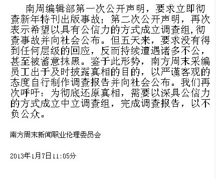 连日来,南方周末新年献词被删改,封面被加上错漏百出的文字,造成南方周末名誉受损,南方周末编辑记者无法忍受这样的耻辱,在新浪、腾讯微博上倾诉,引起众多有识之士的支持,海内外媒体广泛关注,有些媒体和网友矛头直指广东省委宣传部,从而酿成一个公共事件。