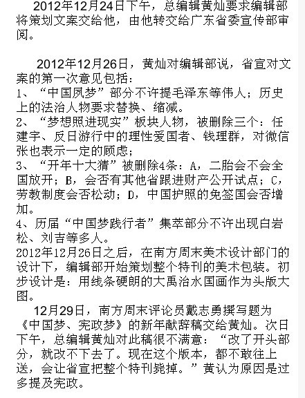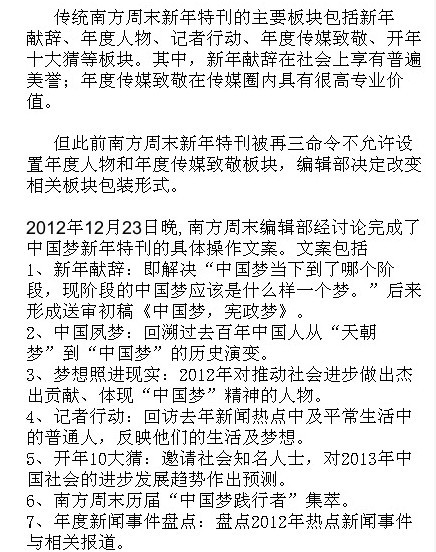 这次2013年新年特刊,方案几经修改调整,到最后还是有好几篇稿件被撤掉,如回访北京水灾遇难者亲属、好友、同事的稿件,反映9.18广州青年在反日保钓游行中文明示威、理性爱国的稿件。新年献词几易其稿,最先的《中国梦,宪政梦》在总编辑这一关就没有过,后来经过评论部几次修改,菱角已经磨平,有关宪政的内容也删的所剩无几。最后定稿送审还被省宣删改,加上不少“伟光正”的内容。封面那段错漏百出的文字,是省宣审改后,没有经过责任编辑加上去的。究竟具体怎么操作,我没有经手也没有进行全面调查,不敢妄下结论,但可以分析一下。