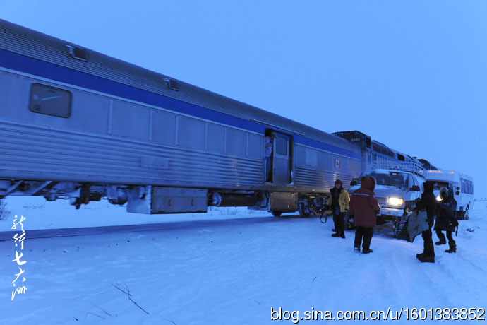 从丘吉尔乘2小时,到40英里外的CHESNAYNE MANITOBA(地名,火车停靠,没有车站),再乘营地的雪地车45分钟,才能到达6英里外的看北极熊的营地(WATCHEE LODGE)。 图:火车停在CHESNAYNE MANITOBA。