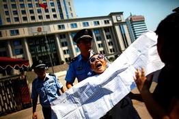 警察将一名请愿者从济南市中级人民法院门外拖走。薄熙来桉周四将在此审理。周三,济南的法院外有少数请愿者表达了对薄熙来的支持。大多数请愿者在便衣警察和身穿制服的警察引导下离开。一个拒绝透露姓名的男子高喊,薄熙来是中国头号政治明星。