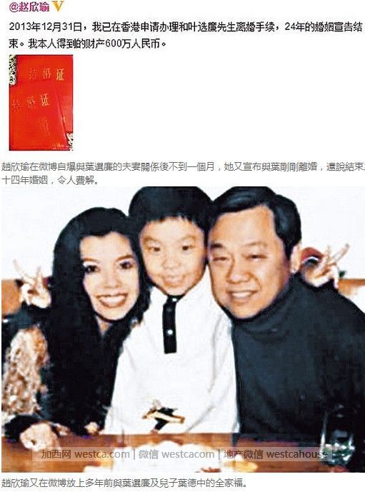 本月初赵欣瑜在微博自爆与叶选廉离婚后获得六百万人民币。