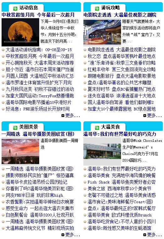 其中 吃喝玩乐温哥华 栏目以提供最及时的活动预告,游玩攻略,美景美图和大温美食等信息为主,是很多网友出外游玩和品尝美食的首选指南。其中活动信息子栏目汇集了大温最全面的活动预告,并为大家介绍新增的旅游景点和游玩项目;旅游攻略部分则结合时令为大家带来各种不同的游玩项目的综合介绍以及详细指南,很多都是网站有着资深游玩经验的小编及网友整理出来的精心之作;而美图美景则为大家提供很多网友的精彩游记,照片以及网上流行的和大温紧密相关的精美摄影作品;当然不可或缺的必定是美食方面的信息,大温美食子栏目为大家带来大温最为食客们追捧的餐馆及美食信息,以及网友们对餐馆的食评。