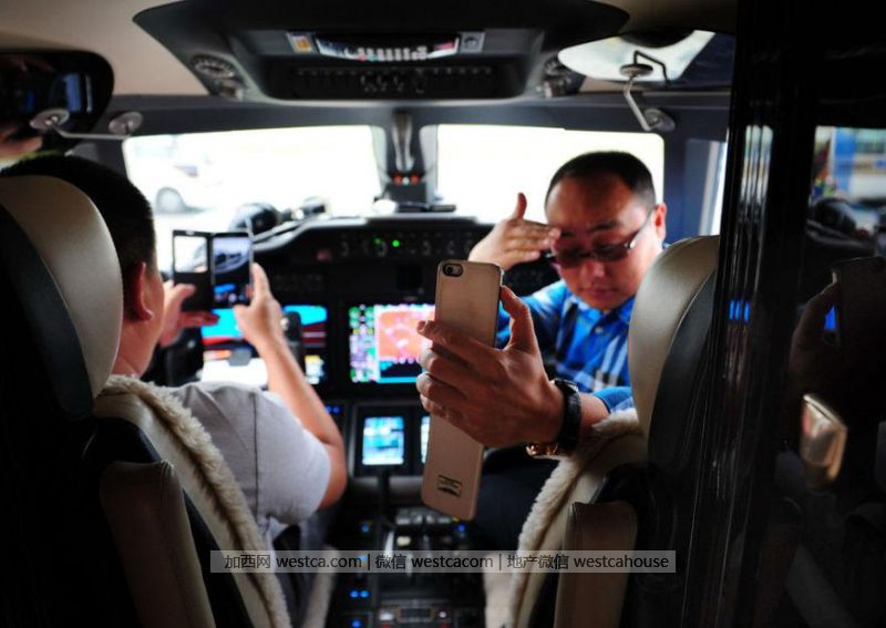 2014年6月5日下午,云南昆明,当地富豪来到长水机场查看待售私人飞机。该架飞机为售价为1.2亿元人民币的喷气式飞机,机上有8个座位,全国有机场的城市均能起降。图为富豪们登机参观,坐在飞机驾驶座上自拍留念。