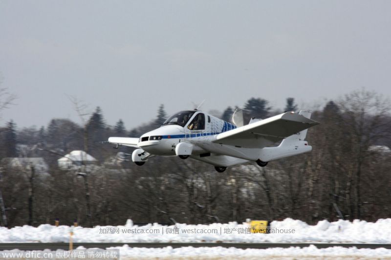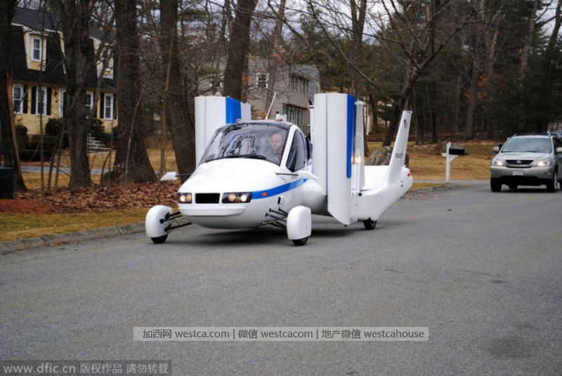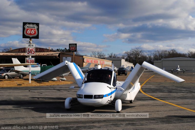 这辆拥有折叠翼的汽车可以容纳四个人,体积小巧,便于停放在车库内。驾驶者需要同时具备飞行和驾驶执照,并拥有20小时的飞行记录。该车制造者的目标是不间断的飞行500英里(约805公里)。