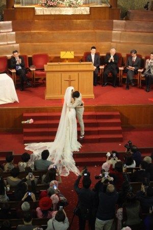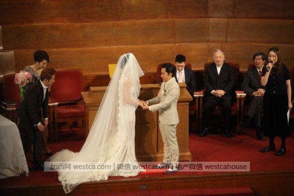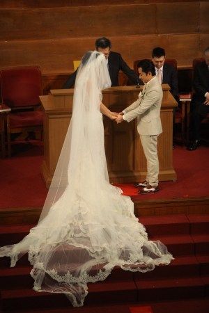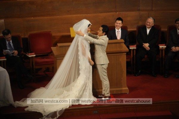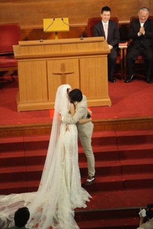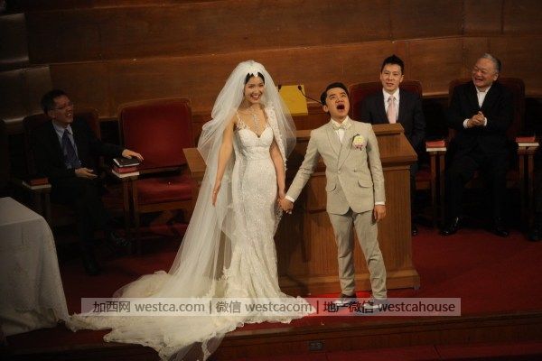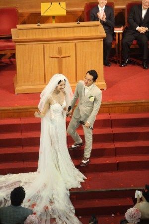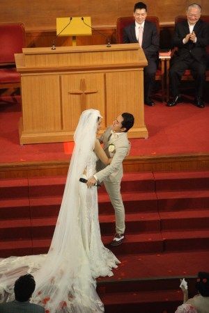两人各自讲誓词后交换戒指,全场再拍掌欢呼,签婚书时,李亚男再因为婚纱拖尾太长要人帮手,之后王菀之唱《彩虹下的约定》。牧师宣布二人正成为夫妇。王祖蓝揭起亚男头纱,两人拖住手亲吻4秒,亲完向宾客挥手,全场又欢呼,祖蓝大叫“哈利路亚”,全场起立唱诗歌《欢欣》,礼成后两个人牵手欢呼,十分兴奋。王祖蓝连喊两声“我愿意”激动呐喊。王祖蓝说“首先感谢神,终于等到这一天了”。说到这里,王祖蓝再次哽咽,李亚男忙拍着他的肩膀安慰他。