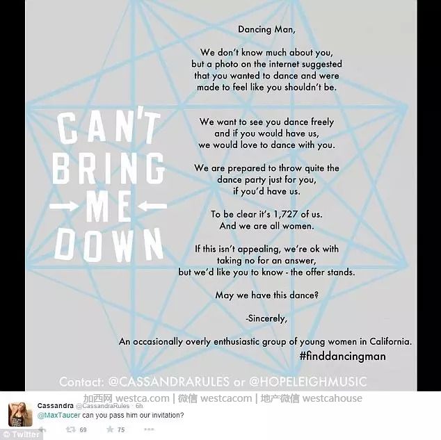 现在,Fairbanks和其他近2000位女士已经为他准备了一个在洛杉矶的盛大VIP舞会,甚至郑重其事地给他发了一张正式的蓝色邀请函,“我们想看你自由自在地跳舞,如果你能来,我们都很乐意与你共舞。”