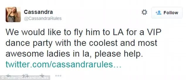 随后Fairbanks代表1727位女士说:“我们希望他飞到洛杉矶来参加这场VIP舞会,这里有洛杉矶最火辣、最性感的美女们,请帮帮我们。”渐渐队伍更加壮大, Casey Horan说:“我们为他准备了一场大型舞会,全是美女萌妹,请帮帮我和我的姐妹们。”