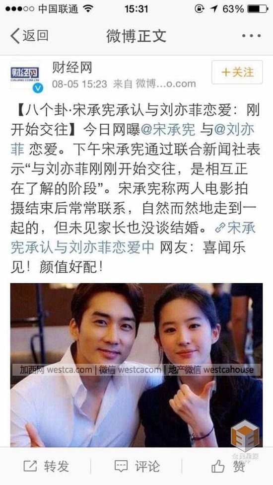 然後過了幾個小時,宋承憲正式承認,和劉亦菲正在交往中,啪啪聲和祝福聲此起彼伏……
