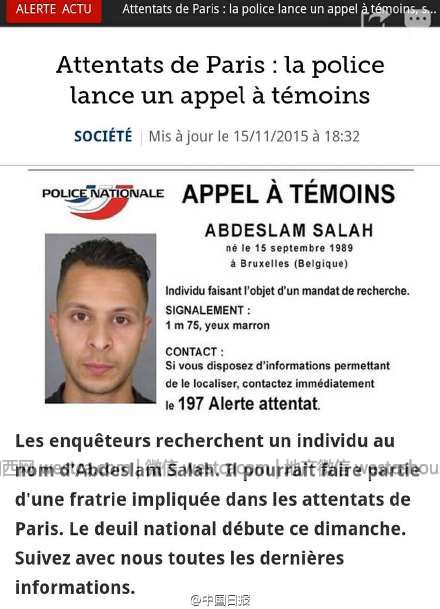 警方签发通缉令,配有嫌疑人照片:26岁的萨拉赫(Abdeslam Salah)。